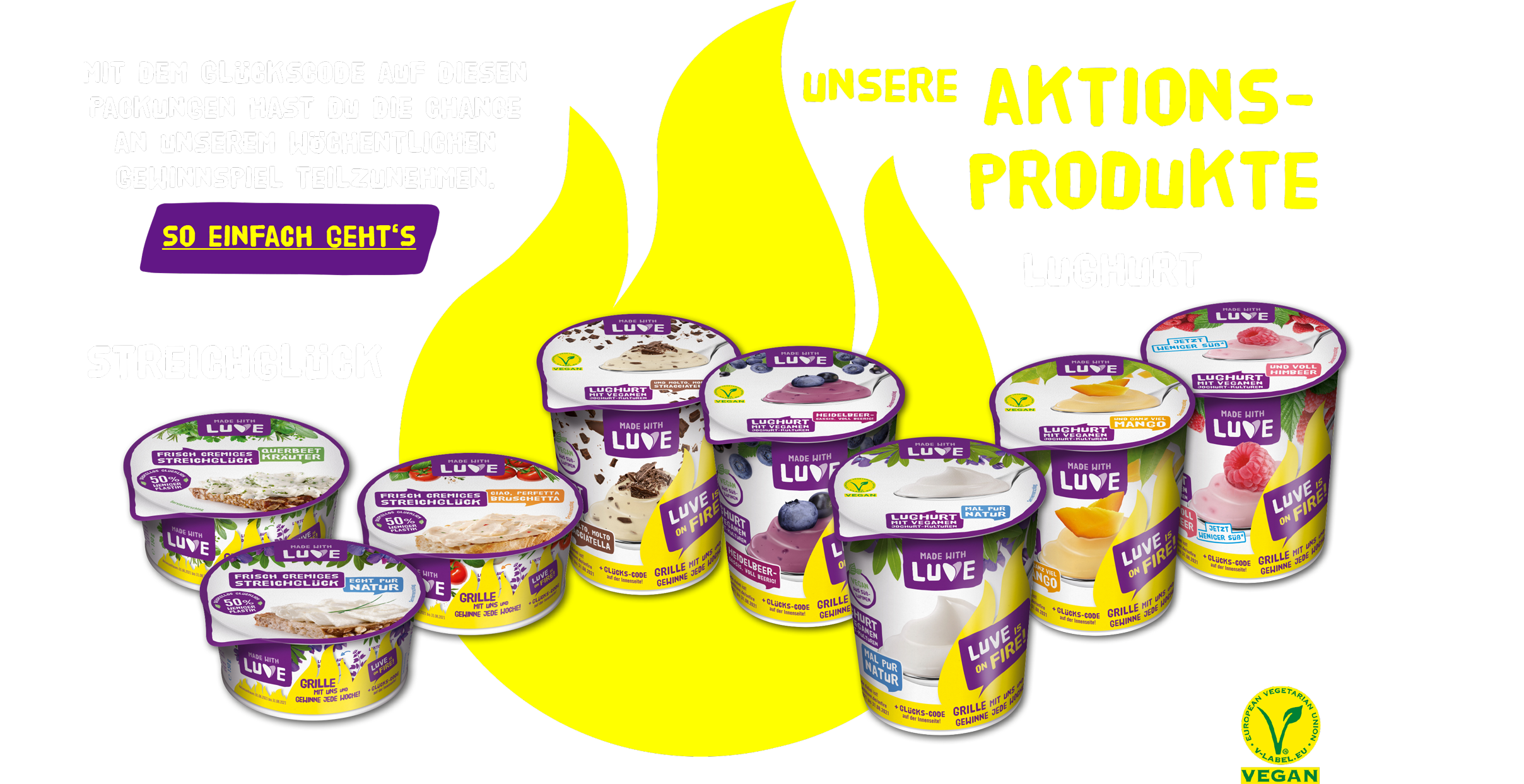 1.4. Jedes im Aktionszeitraum gekaufte Aktionsprodukt enthält einen individuellen Glückscode. Aktionsprodukte sind die Sorten LUVE Lughurt Natur, Himbeer, Mango, Heidelbeer Cassis, Stracciatella oder Streichglück Natur, Kräuter und Bruschetta. Teilnahmeberechtigt sind alle in diesem Aktionszeitraum hochgeladenen Glückscodes (siehe 2.1) über den Kauf von Aktionsprodukten. Die Teilnahme erfolgt durch Eingabe der Glückscodes auf der Aktionsseite www.madewithluve.de/onfire. Dort erfährt der Teilnehmer direkt ob sein Glückscode an der wöchentlichen Verlosung teilnimmt.